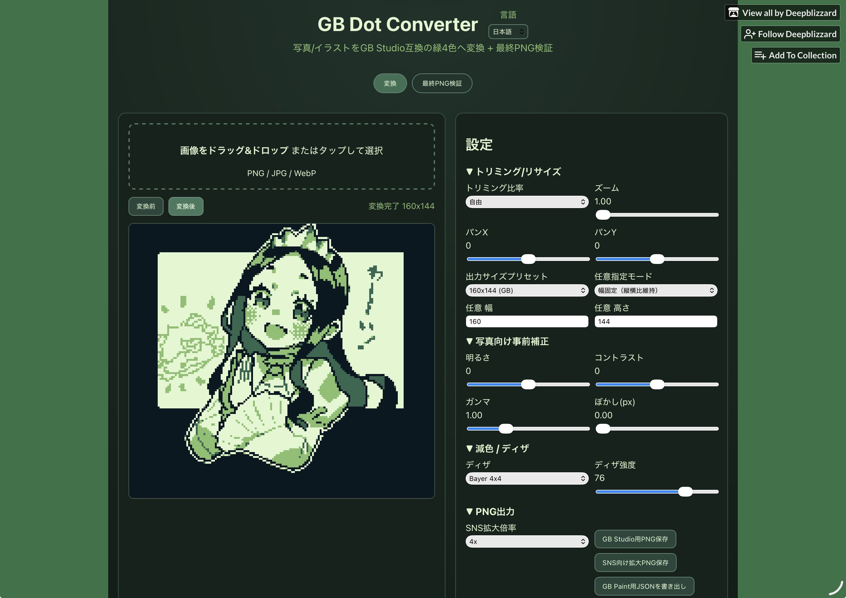 写真やイラストをお手軽にGB風ドットに変換できるツールです。
