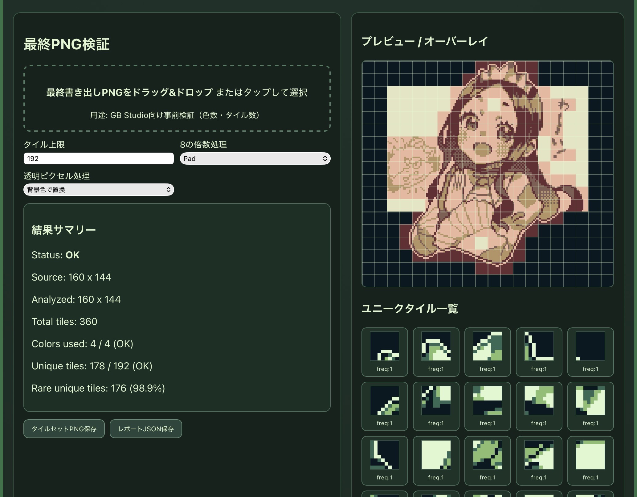 またGB実機での動作できるサイズトリミング、ユニークタイル数のチェック機能つきです。